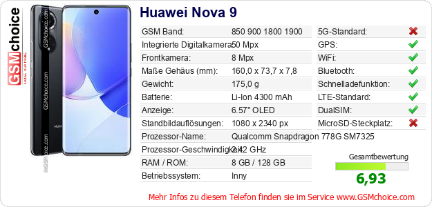 Hast du eigene Webseite? Willst du die Informationen über Standarddaten des Handys Huawei Nova 9 irgendwo veröffentlichen? Das ist sehr einfach. Du kannst das Bild herunterladen oder kopieren und auf der Webseite folgenden Code hinzufügen:Das Einfügen von diesem Code verursacht das Anzeigen von dem folgenden Bild: