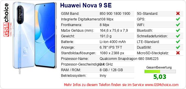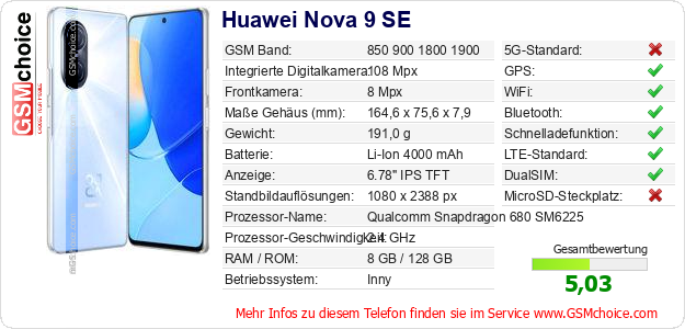 Hast du eigene Webseite? Willst du die Informationen über Standarddaten des Handys Huawei Nova 9 SE irgendwo veröffentlichen? Das ist sehr einfach. Du kannst das Bild herunterladen oder kopieren und auf der Webseite folgenden Code hinzufügen:Das Einfügen von diesem Code verursacht das Anzeigen von dem folgenden Bild: