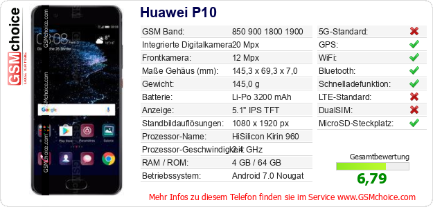 Hast du eigene Webseite? Willst du die Informationen über Standarddaten des Handys Huawei P10 irgendwo veröffentlichen? Das ist sehr einfach. Du kannst das Bild herunterladen oder kopieren und auf der Webseite folgenden Code hinzufügen:Das Einfügen von diesem Code verursacht das Anzeigen von dem folgenden Bild: