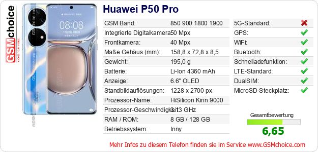 Hast du eigene Webseite? Willst du die Informationen über Standarddaten des Handys Huawei P50 Pro irgendwo veröffentlichen? Das ist sehr einfach. Du kannst das Bild herunterladen oder kopieren und auf der Webseite folgenden Code hinzufügen:Das Einfügen von diesem Code verursacht das Anzeigen von dem folgenden Bild: