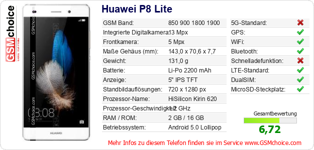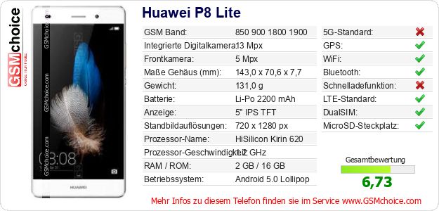 Hast du eigene Webseite? Willst du die Informationen über Standarddaten des Handys Huawei P8 Lite irgendwo veröffentlichen? Das ist sehr einfach. Du kannst das Bild herunterladen oder kopieren und auf der Webseite folgenden Code hinzufügen:Das Einfügen von diesem Code verursacht das Anzeigen von dem folgenden Bild:
