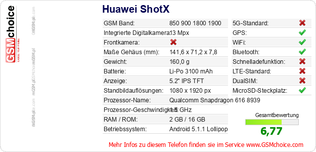Hast du eigene Webseite? Willst du die Informationen über Standarddaten des Handys Huawei ShotX irgendwo veröffentlichen? Das ist sehr einfach. Du kannst das Bild herunterladen oder kopieren und auf der Webseite folgenden Code hinzufügen:Das Einfügen von diesem Code verursacht das Anzeigen von dem folgenden Bild: