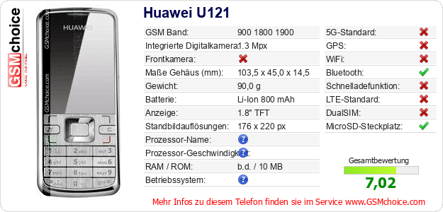 Hast du eigene Webseite? Willst du die Informationen über Standarddaten des Handys Huawei U121 irgendwo veröffentlichen? Das ist sehr einfach. Du kannst das Bild herunterladen oder kopieren und auf der Webseite folgenden Code hinzufügen:Das Einfügen von diesem Code verursacht das Anzeigen von dem folgenden Bild: