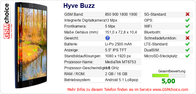 Hast du eigene Webseite? Willst du die Informationen über Standarddaten des Handys Hyve Buzz irgendwo veröffentlichen? Das ist sehr einfach. Du kannst das Bild herunterladen oder kopieren und auf der Webseite folgenden Code hinzufügen:Das Einfügen von diesem Code verursacht das Anzeigen von dem folgenden Bild: