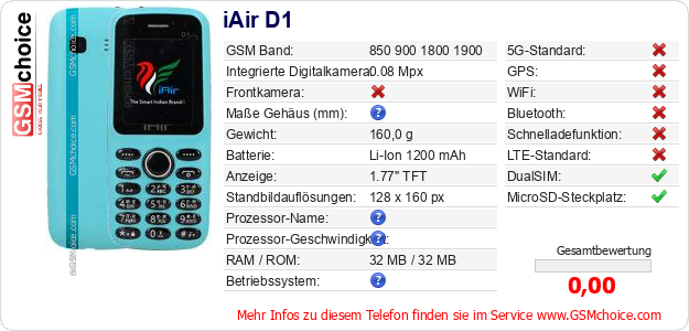 Hast du eigene Webseite? Willst du die Informationen über Standarddaten des Handys iAir D1 irgendwo veröffentlichen? Das ist sehr einfach. Du kannst das Bild herunterladen oder kopieren und auf der Webseite folgenden Code hinzufügen:Das Einfügen von diesem Code verursacht das Anzeigen von dem folgenden Bild:
