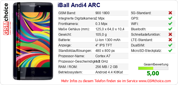 Hast du eigene Webseite? Willst du die Informationen über Standarddaten des Handys iBall Andi4 ARC irgendwo veröffentlichen? Das ist sehr einfach. Du kannst das Bild herunterladen oder kopieren und auf der Webseite folgenden Code hinzufügen:Das Einfügen von diesem Code verursacht das Anzeigen von dem folgenden Bild: