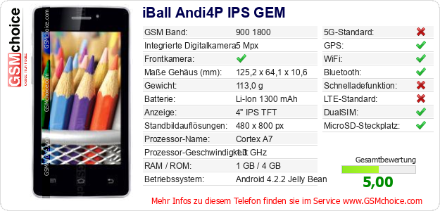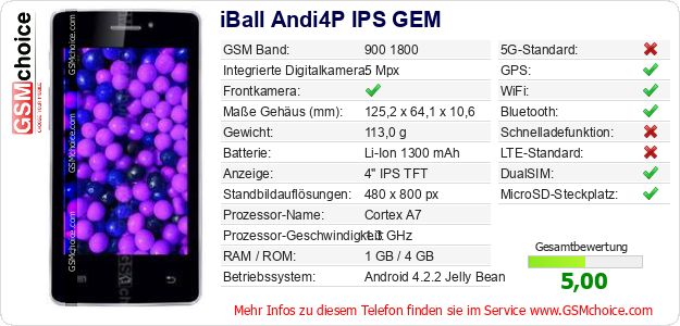 Hast du eigene Webseite? Willst du die Informationen über Standarddaten des Handys iBall Andi4P IPS GEM irgendwo veröffentlichen? Das ist sehr einfach. Du kannst das Bild herunterladen oder kopieren und auf der Webseite folgenden Code hinzufügen:Das Einfügen von diesem Code verursacht das Anzeigen von dem folgenden Bild: