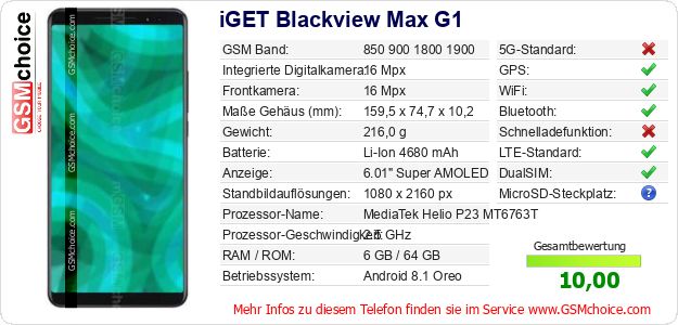 Hast du eigene Webseite? Willst du die Informationen über Standarddaten des Handys iGET Blackview Max G1 irgendwo veröffentlichen? Das ist sehr einfach. Du kannst das Bild herunterladen oder kopieren und auf der Webseite folgenden Code hinzufügen:Das Einfügen von diesem Code verursacht das Anzeigen von dem folgenden Bild: