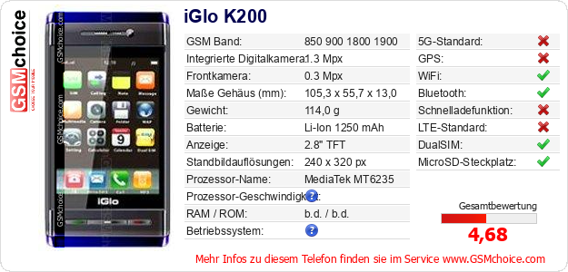 Hast du eigene Webseite? Willst du die Informationen über Standarddaten des Handys iGlo K200 irgendwo veröffentlichen? Das ist sehr einfach. Du kannst das Bild herunterladen oder kopieren und auf der Webseite folgenden Code hinzufügen:Das Einfügen von diesem Code verursacht das Anzeigen von dem folgenden Bild: