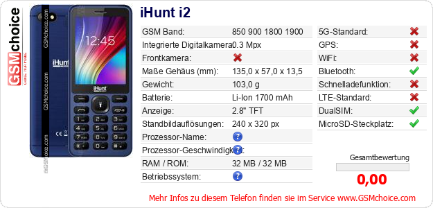 Hast du eigene Webseite? Willst du die Informationen über Standarddaten des Handys iHunt i2 irgendwo veröffentlichen? Das ist sehr einfach. Du kannst das Bild herunterladen oder kopieren und auf der Webseite folgenden Code hinzufügen:Das Einfügen von diesem Code verursacht das Anzeigen von dem folgenden Bild: