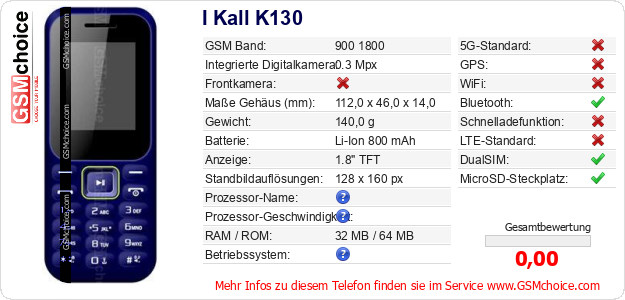Hast du eigene Webseite? Willst du die Informationen über Standarddaten des Handys I Kall K130 irgendwo veröffentlichen? Das ist sehr einfach. Du kannst das Bild herunterladen oder kopieren und auf der Webseite folgenden Code hinzufügen:Das Einfügen von diesem Code verursacht das Anzeigen von dem folgenden Bild: