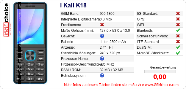 Hast du eigene Webseite? Willst du die Informationen über Standarddaten des Handys I Kall K18 irgendwo veröffentlichen? Das ist sehr einfach. Du kannst das Bild herunterladen oder kopieren und auf der Webseite folgenden Code hinzufügen:Das Einfügen von diesem Code verursacht das Anzeigen von dem folgenden Bild: