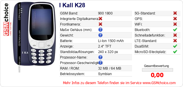Hast du eigene Webseite? Willst du die Informationen über Standarddaten des Handys I Kall K28 irgendwo veröffentlichen? Das ist sehr einfach. Du kannst das Bild herunterladen oder kopieren und auf der Webseite folgenden Code hinzufügen:Das Einfügen von diesem Code verursacht das Anzeigen von dem folgenden Bild: