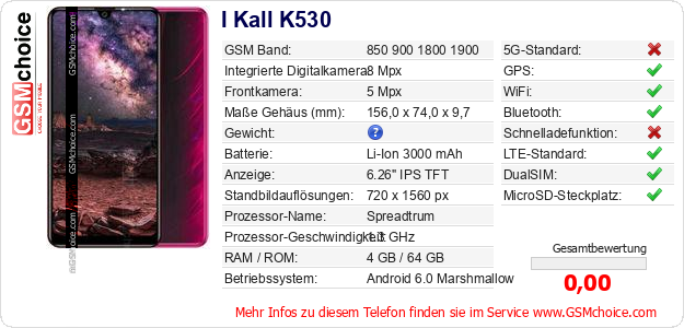 Hast du eigene Webseite? Willst du die Informationen über Standarddaten des Handys I Kall K530 irgendwo veröffentlichen? Das ist sehr einfach. Du kannst das Bild herunterladen oder kopieren und auf der Webseite folgenden Code hinzufügen:Das Einfügen von diesem Code verursacht das Anzeigen von dem folgenden Bild:
