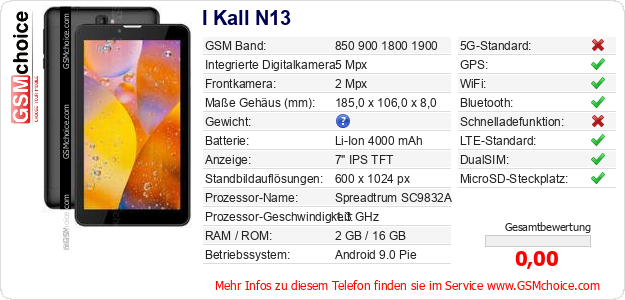 Hast du eigene Webseite? Willst du die Informationen über Standarddaten des Handys I Kall N13 irgendwo veröffentlichen? Das ist sehr einfach. Du kannst das Bild herunterladen oder kopieren und auf der Webseite folgenden Code hinzufügen:Das Einfügen von diesem Code verursacht das Anzeigen von dem folgenden Bild:
