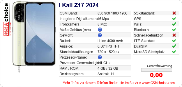 Hast du eigene Webseite? Willst du die Informationen über Standarddaten des Handys I Kall Z17 2024 irgendwo veröffentlichen? Das ist sehr einfach. Du kannst das Bild herunterladen oder kopieren und auf der Webseite folgenden Code hinzufügen:Das Einfügen von diesem Code verursacht das Anzeigen von dem folgenden Bild: