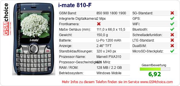 Hast du eigene Webseite? Willst du die Informationen über Standarddaten des Handys i-mate 810-F irgendwo veröffentlichen? Das ist sehr einfach. Du kannst das Bild herunterladen oder kopieren und auf der Webseite folgenden Code hinzufügen:Das Einfügen von diesem Code verursacht das Anzeigen von dem folgenden Bild: