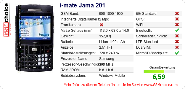 Hast du eigene Webseite? Willst du die Informationen über Standarddaten des Handys i-mate Jama 201 irgendwo veröffentlichen? Das ist sehr einfach. Du kannst das Bild herunterladen oder kopieren und auf der Webseite folgenden Code hinzufügen:Das Einfügen von diesem Code verursacht das Anzeigen von dem folgenden Bild: