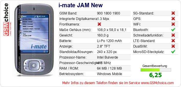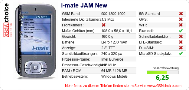 Hast du eigene Webseite? Willst du die Informationen über Standarddaten des Handys i-mate JAM New irgendwo veröffentlichen? Das ist sehr einfach. Du kannst das Bild herunterladen oder kopieren und auf der Webseite folgenden Code hinzufügen:Das Einfügen von diesem Code verursacht das Anzeigen von dem folgenden Bild: