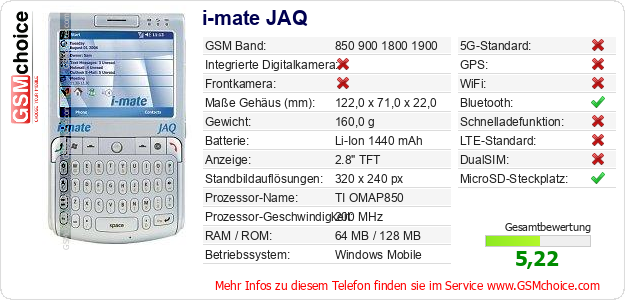 Hast du eigene Webseite? Willst du die Informationen über Standarddaten des Handys i-mate JAQ irgendwo veröffentlichen? Das ist sehr einfach. Du kannst das Bild herunterladen oder kopieren und auf der Webseite folgenden Code hinzufügen:Das Einfügen von diesem Code verursacht das Anzeigen von dem folgenden Bild: