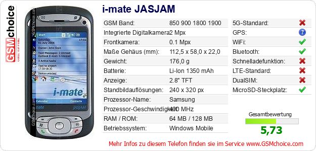 Hast du eigene Webseite? Willst du die Informationen über Standarddaten des Handys i-mate JASJAM irgendwo veröffentlichen? Das ist sehr einfach. Du kannst das Bild herunterladen oder kopieren und auf der Webseite folgenden Code hinzufügen:Das Einfügen von diesem Code verursacht das Anzeigen von dem folgenden Bild: