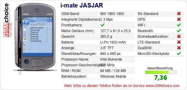 Hast du eigene Webseite? Willst du die Informationen über Standarddaten des Handys i-mate JASJAR irgendwo veröffentlichen? Das ist sehr einfach. Du kannst das Bild herunterladen oder kopieren und auf der Webseite folgenden Code hinzufügen:Das Einfügen von diesem Code verursacht das Anzeigen von dem folgenden Bild: