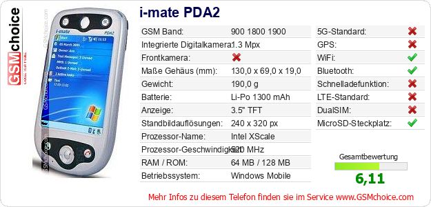 Hast du eigene Webseite? Willst du die Informationen über Standarddaten des Handys i-mate PDA2 irgendwo veröffentlichen? Das ist sehr einfach. Du kannst das Bild herunterladen oder kopieren und auf der Webseite folgenden Code hinzufügen:Das Einfügen von diesem Code verursacht das Anzeigen von dem folgenden Bild: