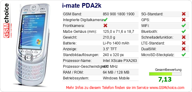 Hast du eigene Webseite? Willst du die Informationen über Standarddaten des Handys i-mate PDA2k irgendwo veröffentlichen? Das ist sehr einfach. Du kannst das Bild herunterladen oder kopieren und auf der Webseite folgenden Code hinzufügen:Das Einfügen von diesem Code verursacht das Anzeigen von dem folgenden Bild:
