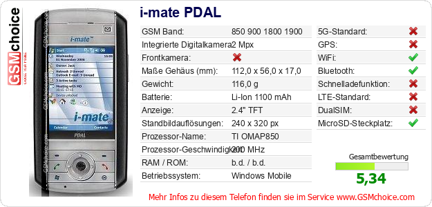 Hast du eigene Webseite? Willst du die Informationen über Standarddaten des Handys i-mate PDAL irgendwo veröffentlichen? Das ist sehr einfach. Du kannst das Bild herunterladen oder kopieren und auf der Webseite folgenden Code hinzufügen:Das Einfügen von diesem Code verursacht das Anzeigen von dem folgenden Bild: