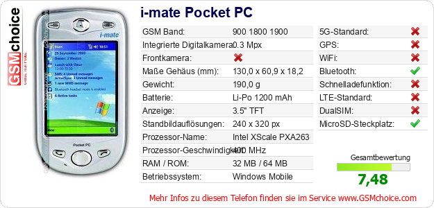 Hast du eigene Webseite? Willst du die Informationen über Standarddaten des Handys i-mate Pocket PC irgendwo veröffentlichen? Das ist sehr einfach. Du kannst das Bild herunterladen oder kopieren und auf der Webseite folgenden Code hinzufügen:Das Einfügen von diesem Code verursacht das Anzeigen von dem folgenden Bild:
