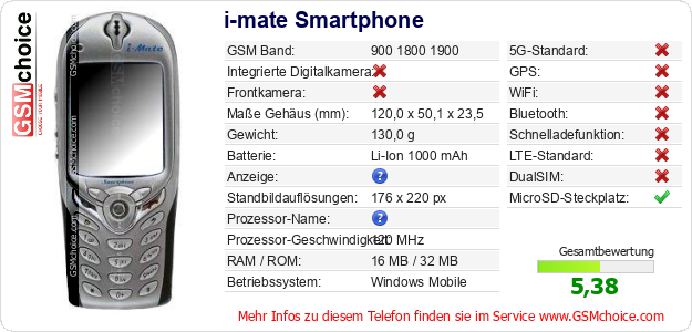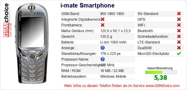 Hast du eigene Webseite? Willst du die Informationen über Standarddaten des Handys i-mate Smartphone irgendwo veröffentlichen? Das ist sehr einfach. Du kannst das Bild herunterladen oder kopieren und auf der Webseite folgenden Code hinzufügen:Das Einfügen von diesem Code verursacht das Anzeigen von dem folgenden Bild: