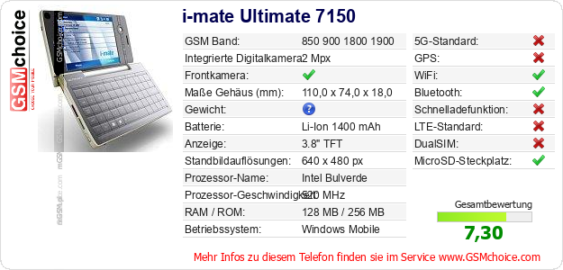 Hast du eigene Webseite? Willst du die Informationen über Standarddaten des Handys i-mate Ultimate 7150 irgendwo veröffentlichen? Das ist sehr einfach. Du kannst das Bild herunterladen oder kopieren und auf der Webseite folgenden Code hinzufügen:Das Einfügen von diesem Code verursacht das Anzeigen von dem folgenden Bild: