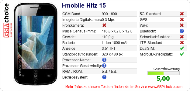 Hast du eigene Webseite? Willst du die Informationen über Standarddaten des Handys i-mobile Hitz 15 irgendwo veröffentlichen? Das ist sehr einfach. Du kannst das Bild herunterladen oder kopieren und auf der Webseite folgenden Code hinzufügen:Das Einfügen von diesem Code verursacht das Anzeigen von dem folgenden Bild:
