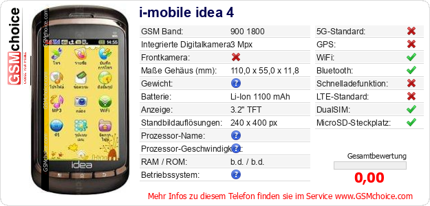 Hast du eigene Webseite? Willst du die Informationen über Standarddaten des Handys i-mobile idea 4 irgendwo veröffentlichen? Das ist sehr einfach. Du kannst das Bild herunterladen oder kopieren und auf der Webseite folgenden Code hinzufügen:Das Einfügen von diesem Code verursacht das Anzeigen von dem folgenden Bild: