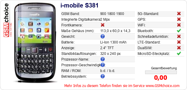 Hast du eigene Webseite? Willst du die Informationen über Standarddaten des Handys i-mobile S381 irgendwo veröffentlichen? Das ist sehr einfach. Du kannst das Bild herunterladen oder kopieren und auf der Webseite folgenden Code hinzufügen:Das Einfügen von diesem Code verursacht das Anzeigen von dem folgenden Bild: