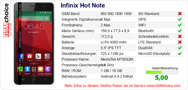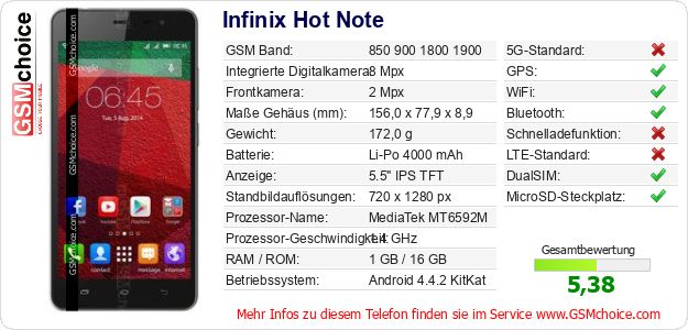 Hast du eigene Webseite? Willst du die Informationen über Standarddaten des Handys Infinix Hot Note irgendwo veröffentlichen? Das ist sehr einfach. Du kannst das Bild herunterladen oder kopieren und auf der Webseite folgenden Code hinzufügen:Das Einfügen von diesem Code verursacht das Anzeigen von dem folgenden Bild: