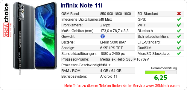 Hast du eigene Webseite? Willst du die Informationen über Standarddaten des Handys Infinix Note 11i irgendwo veröffentlichen? Das ist sehr einfach. Du kannst das Bild herunterladen oder kopieren und auf der Webseite folgenden Code hinzufügen:Das Einfügen von diesem Code verursacht das Anzeigen von dem folgenden Bild: