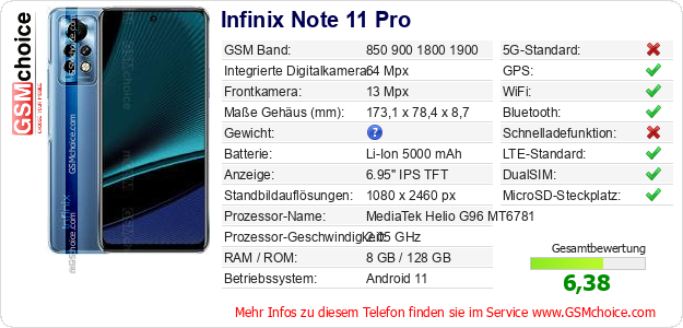 Hast du eigene Webseite? Willst du die Informationen über Standarddaten des Handys Infinix Note 11 Pro irgendwo veröffentlichen? Das ist sehr einfach. Du kannst das Bild herunterladen oder kopieren und auf der Webseite folgenden Code hinzufügen:Das Einfügen von diesem Code verursacht das Anzeigen von dem folgenden Bild:
