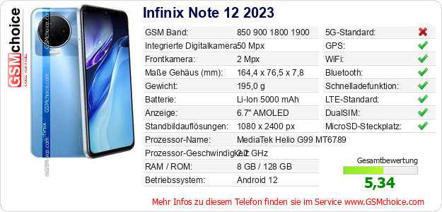 Hast du eigene Webseite? Willst du die Informationen über Standarddaten des Handys Infinix Note 12 2023 irgendwo veröffentlichen? Das ist sehr einfach. Du kannst das Bild herunterladen oder kopieren und auf der Webseite folgenden Code hinzufügen:Das Einfügen von diesem Code verursacht das Anzeigen von dem folgenden Bild: