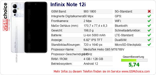 Hast du eigene Webseite? Willst du die Informationen über Standarddaten des Handys Infinix Note 12i irgendwo veröffentlichen? Das ist sehr einfach. Du kannst das Bild herunterladen oder kopieren und auf der Webseite folgenden Code hinzufügen:Das Einfügen von diesem Code verursacht das Anzeigen von dem folgenden Bild: