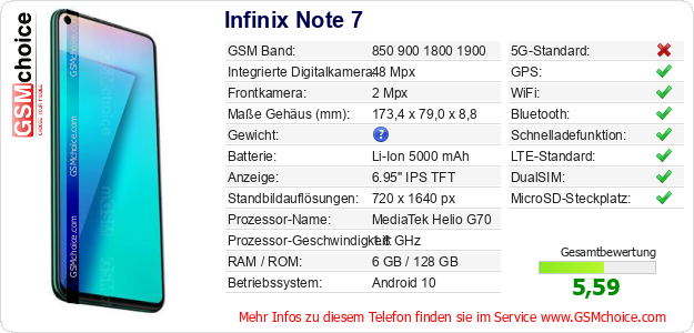 Hast du eigene Webseite? Willst du die Informationen über Standarddaten des Handys Infinix Note 7 irgendwo veröffentlichen? Das ist sehr einfach. Du kannst das Bild herunterladen oder kopieren und auf der Webseite folgenden Code hinzufügen:Das Einfügen von diesem Code verursacht das Anzeigen von dem folgenden Bild: