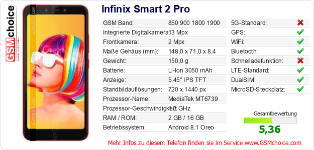 Hast du eigene Webseite? Willst du die Informationen über Standarddaten des Handys Infinix Smart 2 Pro irgendwo veröffentlichen? Das ist sehr einfach. Du kannst das Bild herunterladen oder kopieren und auf der Webseite folgenden Code hinzufügen:Das Einfügen von diesem Code verursacht das Anzeigen von dem folgenden Bild:
