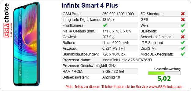 Hast du eigene Webseite? Willst du die Informationen über Standarddaten des Handys Infinix Smart 4 Plus irgendwo veröffentlichen? Das ist sehr einfach. Du kannst das Bild herunterladen oder kopieren und auf der Webseite folgenden Code hinzufügen:Das Einfügen von diesem Code verursacht das Anzeigen von dem folgenden Bild: