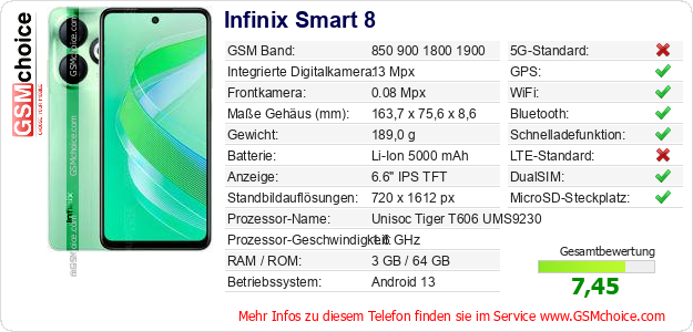 Hast du eigene Webseite? Willst du die Informationen über Standarddaten des Handys Infinix Smart 8 irgendwo veröffentlichen? Das ist sehr einfach. Du kannst das Bild herunterladen oder kopieren und auf der Webseite folgenden Code hinzufügen:Das Einfügen von diesem Code verursacht das Anzeigen von dem folgenden Bild: