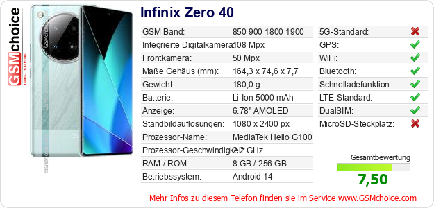 Hast du eigene Webseite? Willst du die Informationen über Standarddaten des Handys Infinix Zero 40 irgendwo veröffentlichen? Das ist sehr einfach. Du kannst das Bild herunterladen oder kopieren und auf der Webseite folgenden Code hinzufügen:Das Einfügen von diesem Code verursacht das Anzeigen von dem folgenden Bild: