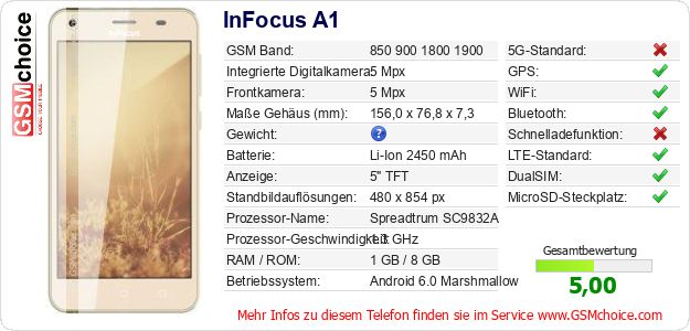 Hast du eigene Webseite? Willst du die Informationen über Standarddaten des Handys InFocus A1 irgendwo veröffentlichen? Das ist sehr einfach. Du kannst das Bild herunterladen oder kopieren und auf der Webseite folgenden Code hinzufügen:Das Einfügen von diesem Code verursacht das Anzeigen von dem folgenden Bild: