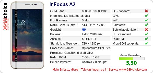 Hast du eigene Webseite? Willst du die Informationen über Standarddaten des Handys InFocus A2 irgendwo veröffentlichen? Das ist sehr einfach. Du kannst das Bild herunterladen oder kopieren und auf der Webseite folgenden Code hinzufügen:Das Einfügen von diesem Code verursacht das Anzeigen von dem folgenden Bild: