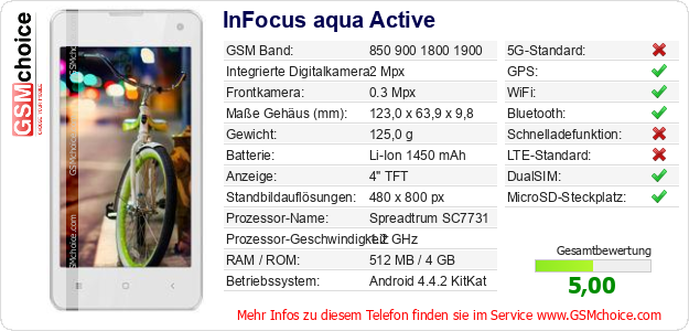 Hast du eigene Webseite? Willst du die Informationen über Standarddaten des Handys InFocus aqua Active irgendwo veröffentlichen? Das ist sehr einfach. Du kannst das Bild herunterladen oder kopieren und auf der Webseite folgenden Code hinzufügen:Das Einfügen von diesem Code verursacht das Anzeigen von dem folgenden Bild: