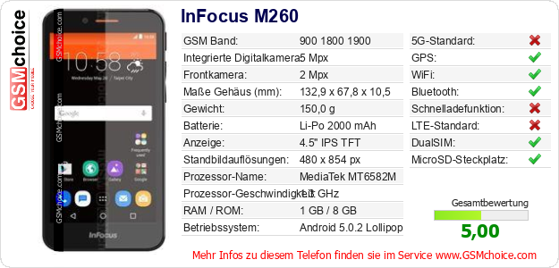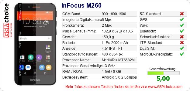 Hast du eigene Webseite? Willst du die Informationen über Standarddaten des Handys InFocus M260 irgendwo veröffentlichen? Das ist sehr einfach. Du kannst das Bild herunterladen oder kopieren und auf der Webseite folgenden Code hinzufügen:Das Einfügen von diesem Code verursacht das Anzeigen von dem folgenden Bild: