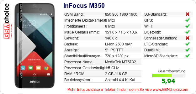 Hast du eigene Webseite? Willst du die Informationen über Standarddaten des Handys InFocus M350 irgendwo veröffentlichen? Das ist sehr einfach. Du kannst das Bild herunterladen oder kopieren und auf der Webseite folgenden Code hinzufügen:Das Einfügen von diesem Code verursacht das Anzeigen von dem folgenden Bild: